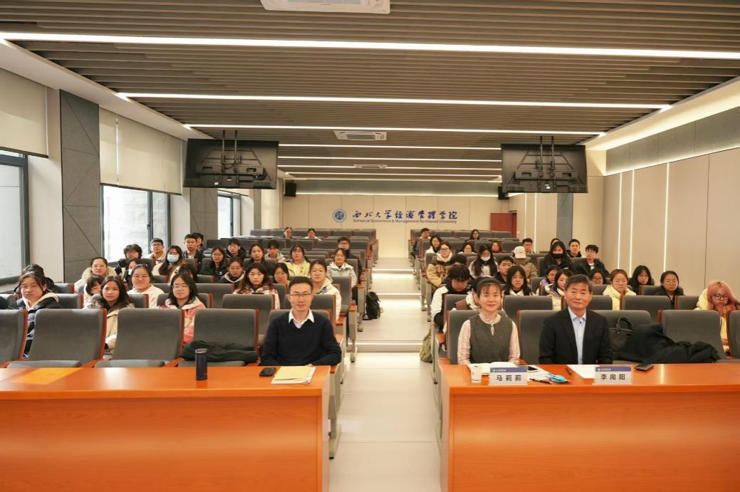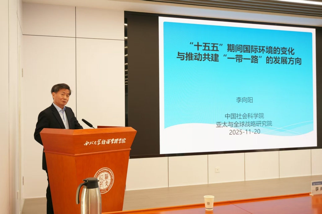 随后在经济管理学院山峰报告厅,李向阳研究员做客“侯外庐学术讲座”第四百七十三讲,以“十五五”期间国际环境的变化与推动共建“一带一路”的发展方向为题,为经济管理学院师生带来一场精彩的学术报告。讲座由经济管理学院院长马莉莉教授主持,学院部分青年教师和国际经济与贸易系学生参加。