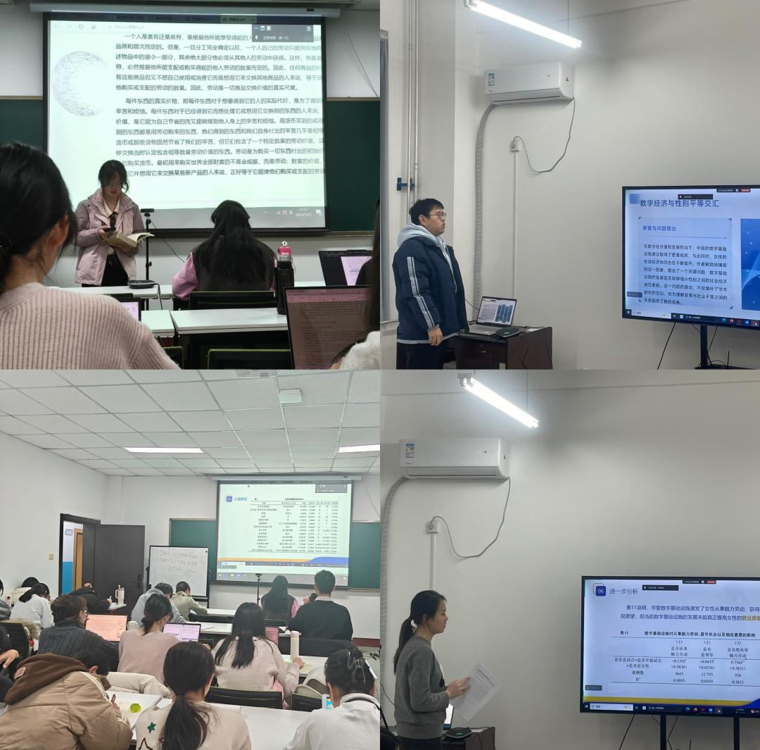 本次“基地学术课堂”活动的第一单元为文献研习,所学文献为《数字基础设施能否缩小社会经济地位的性别差距》,来自《世界经济》2024年第10期。2023级经济学基地班本科生李丞惠担任主讲。她从数字基建快速发展但男女地位差距仍存在为切入点,引出“数字基础设施的发展能否缩小社会经济地位的性别差距”这一核心问题。并分析作者通过模型与数据应用,得出数字基础设施缩小了人力资本、市场劳动参与方面的性别差距这一过程,最后阐释中国需要进一步强化数字基础设施建设这一政策启示。