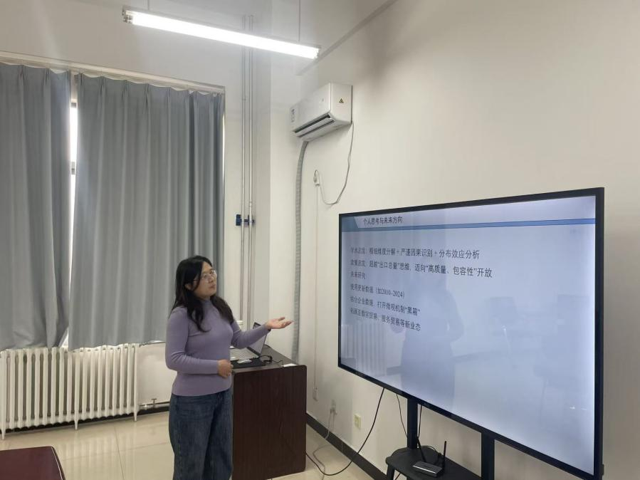 本次“基地学术课堂”活动的第一单元为文献研习,所学文献为《出口目的国收入水平与城市工资差距》,来自《经济学(季刊)》2024年第6期。2023级经济学基地班本科生张璐担任主讲。她以赫克歇尔-俄林模型预测为切入点,引出“中国工资差距扩大”这一现实问题。并进一步分析作者实证模型设定、分位数回归方法,介绍一般贸易的平均与分位效应等主要发现,最后阐释了作者“向高收入国家的一般出口显著提升城市居民工资,且高收入者受益最多,进而扩大城市间与城市内部工资差距”这一结论。