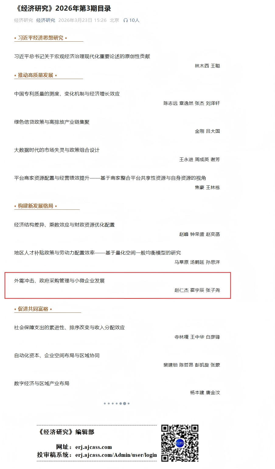 近日,我院经济学系赵仁杰教授与学院博士研究生霍宇辰合作的论文《外需冲击、政府采购管理与小微企业发展》在顶级期刊《经济研究》2026年第3期发表,该文是赵仁杰老师主持的国家自然科学基金面上项目、陕西高校青年创新团队项目的阶段性成果。