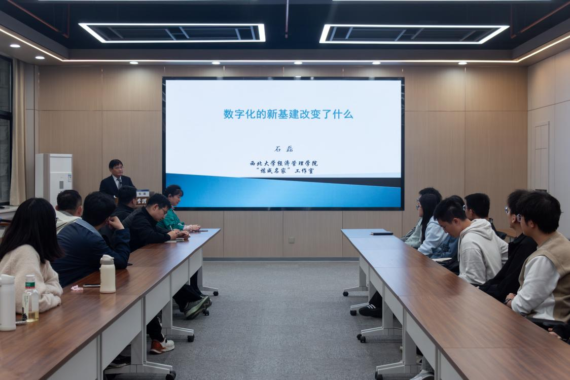 仪式结束后,石磊为师生作了题为《数字化的新基建改变了什么》的报告。重点围绕“经济体系的微观基础,经济增长动力结构和企业盈利模式,中国产业生态,人们对战略资产配置认知,技术迭代周期,经济类专业”六个方面内容,对由数字化新基建带来的改变进行了深度解析。