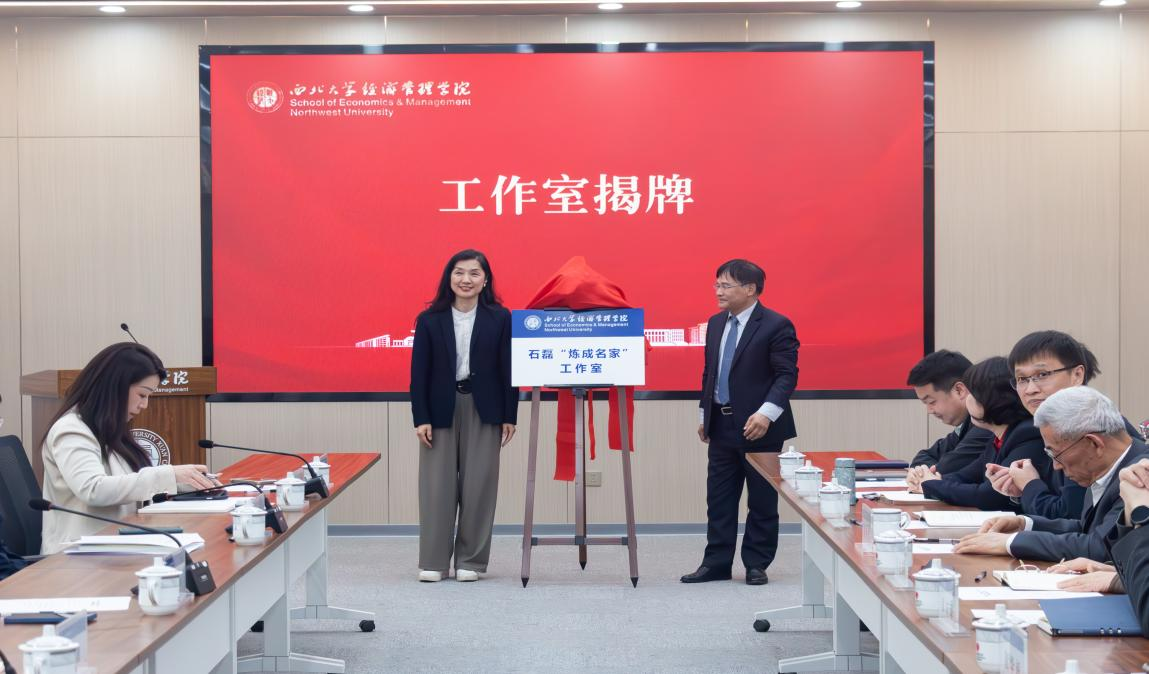 石磊在讲话中深情回顾了在西北大学的求学经历和导师之间的深厚情谊,对学校、学院的信任与支持表示感谢。他表示,将全力搭建好工作室学术平台,切实履行职责,带领研究团队立足学校学院发展目标,在学科建设、人才培养、科学研究、学术交流等方面精准发力,推动我校经管学科高质量发展,为学校“双一流”建设和西部经济社会发展贡献力量。
