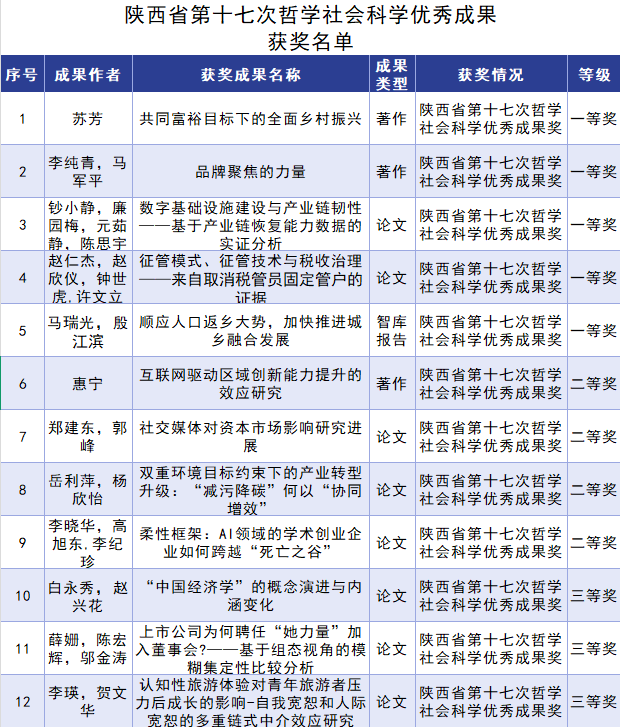 近日,陕西省人民政府正式发布了《关于表彰第十七次哲学社会科学优秀成果的通报》,公布了本届优秀成果奖获奖名单。我院师生在此次评选中喜获佳绩,共获得12项奖励,其中一等奖5项、二等奖4项、三等奖3项。