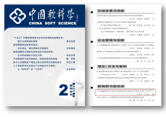 近日,我院经济学系白永秀教授与其指导的博士研究生闫雪培合作的论文《人工智能时代社会再生产过程的分化与重构:从“四环节”到“六环节”》作为封面文章在权威期刊《中国软科学》2026年第2期发表。